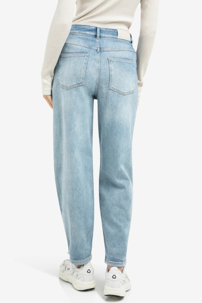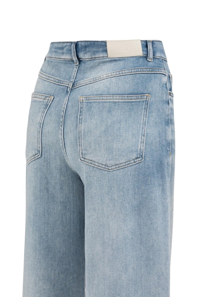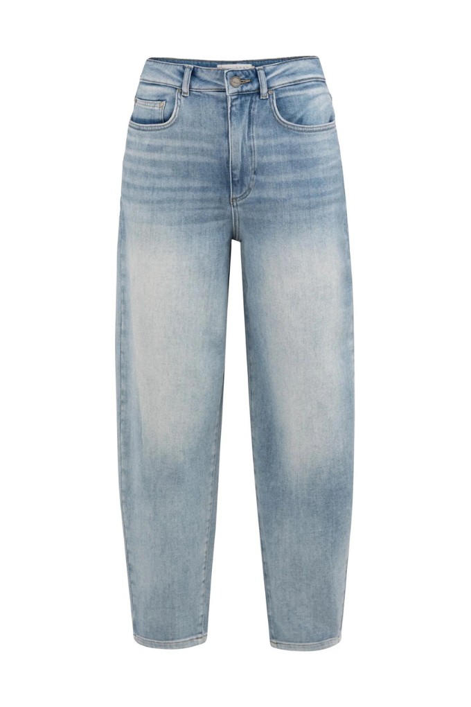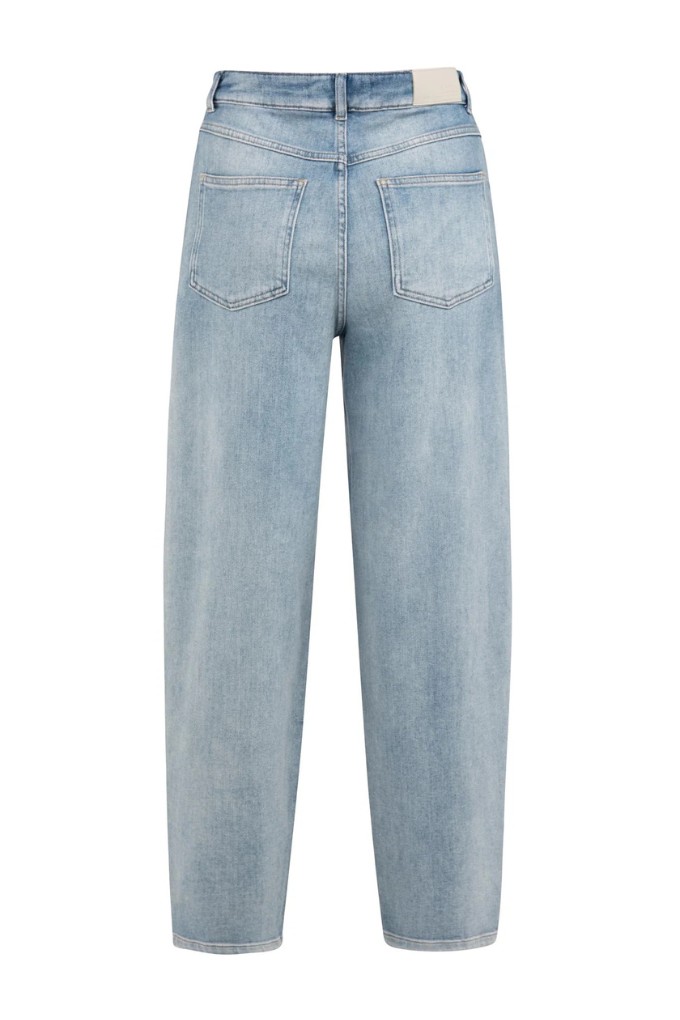 Ce jean bleu délavé présente une taille haute et une coupe droite ample. Il possède cinq poches classique et est resserré juste au-dessus de la cheville.
