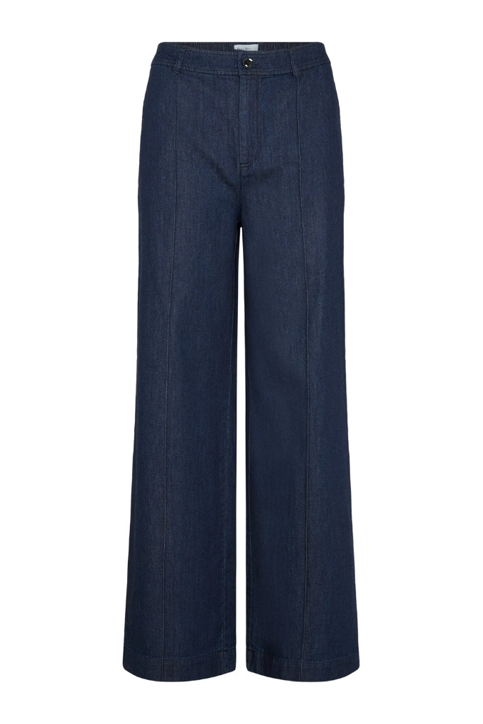 Ce pantalon en denim présente une coupe droite et ample avec des plis marqués. Il est doté de poches latérales et de passants de ceinture.