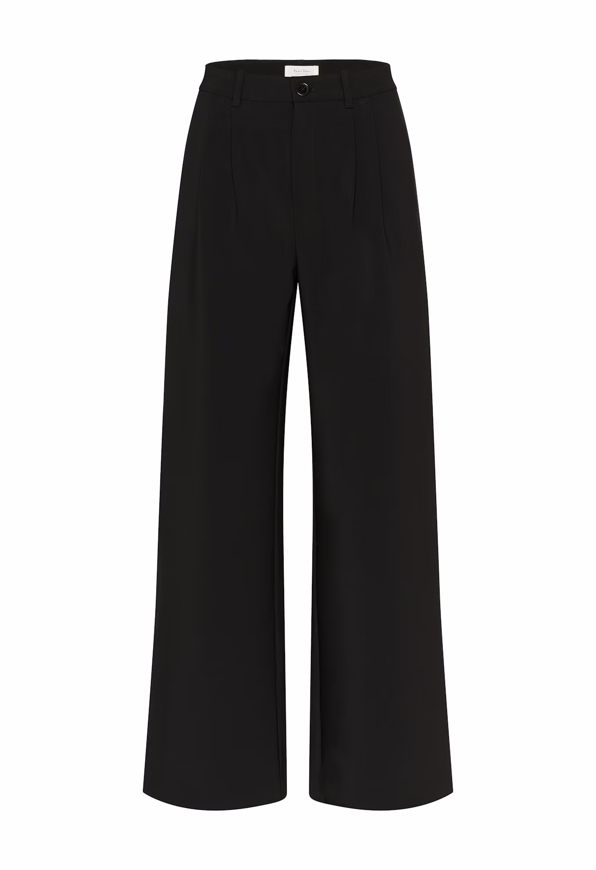 Ce pantalon noir a une coupe décontractée et des plis sur le devant. Sa taille haute et ses jambes larges allongent la silhouette.
