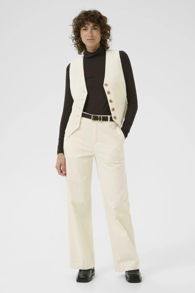 Ce pantalon en velours côtelé a une coupe classique, des jambes longues et droites. Il possède des poches intérieures fendues et deux fausses poches à l’arrière. La braguette est à fermeture éclair.