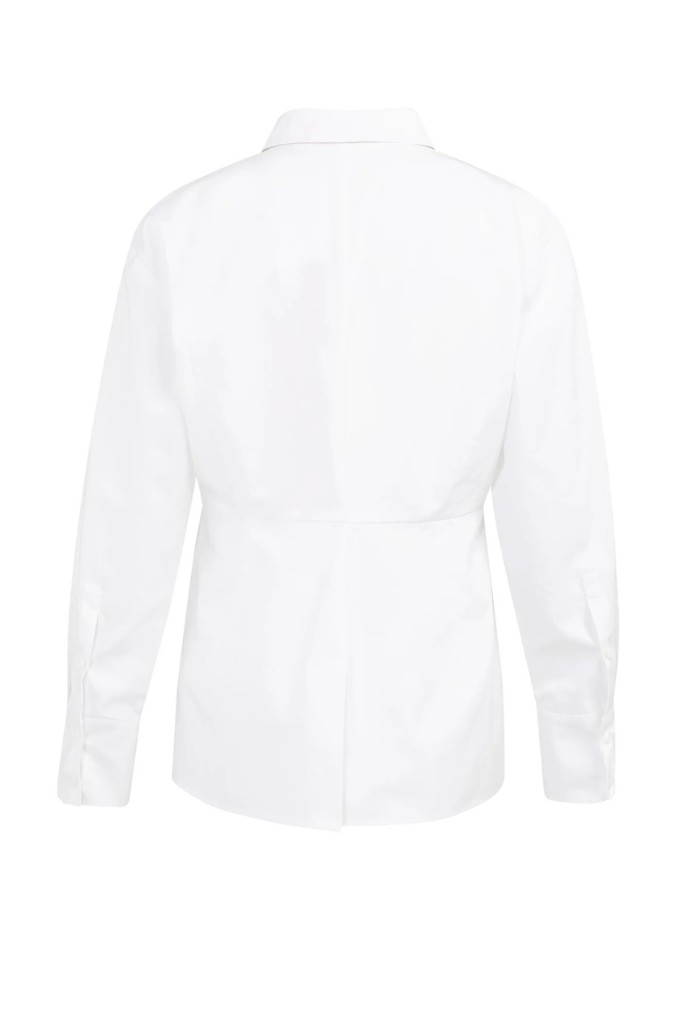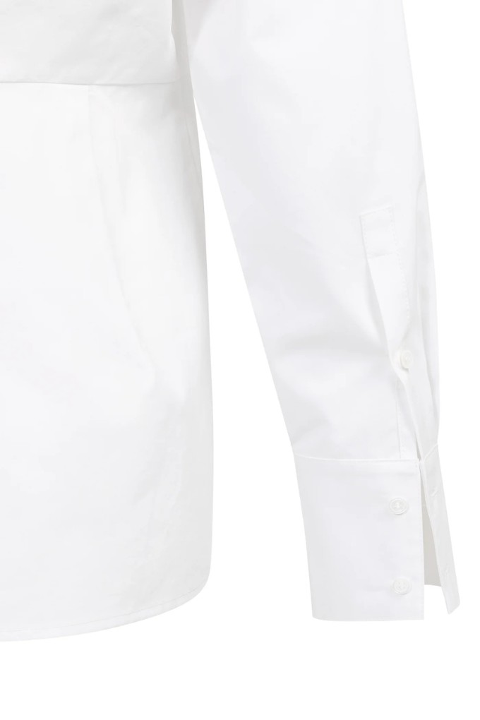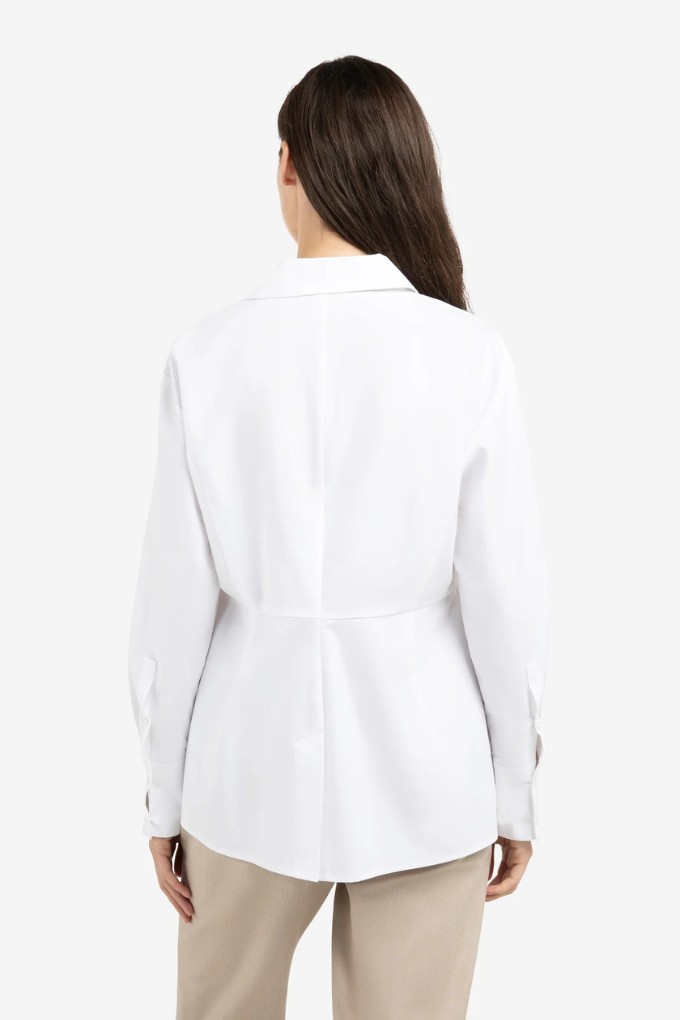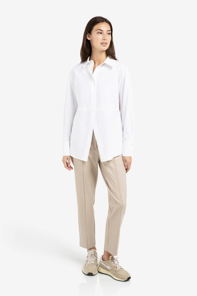 Cette blouse en popeline lisse arbore une silhouette trapèze. Elle est dotée d’un col classique, de manches longues avec poignets et d’une fente avant marquante. Une fine couture est également présente à hauteur de poitrine.