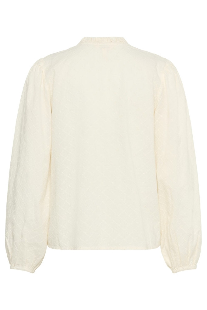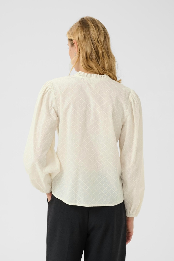 Ce chemisier léger présente une texture délicate et de subtils motifs brodés. Il possède un petit col montant et une encolure ouverte.
