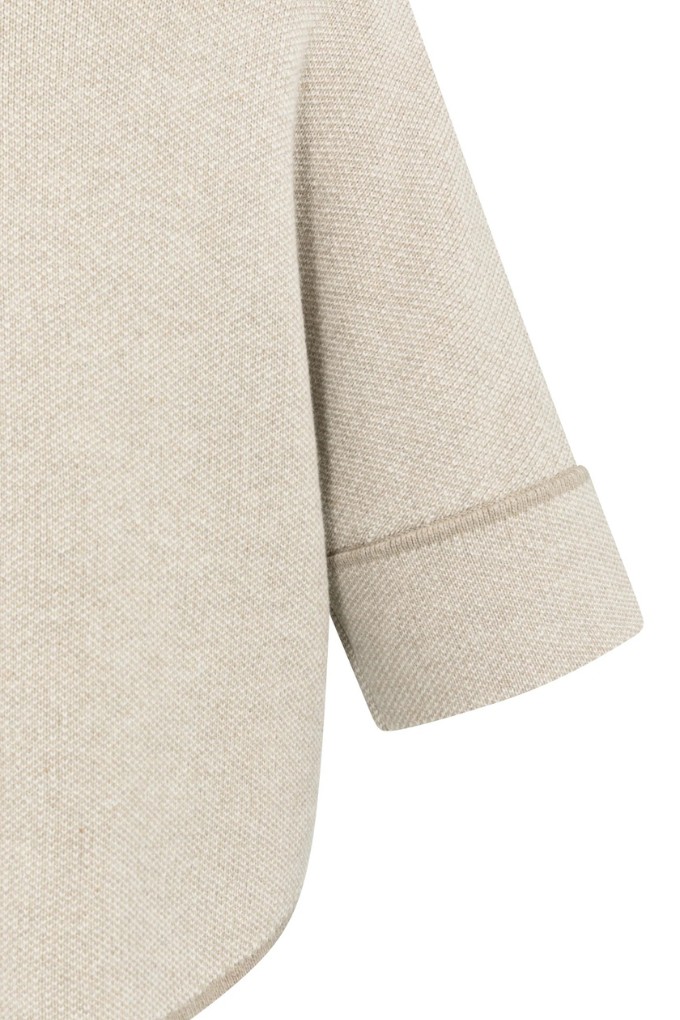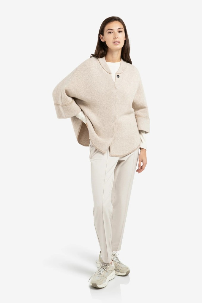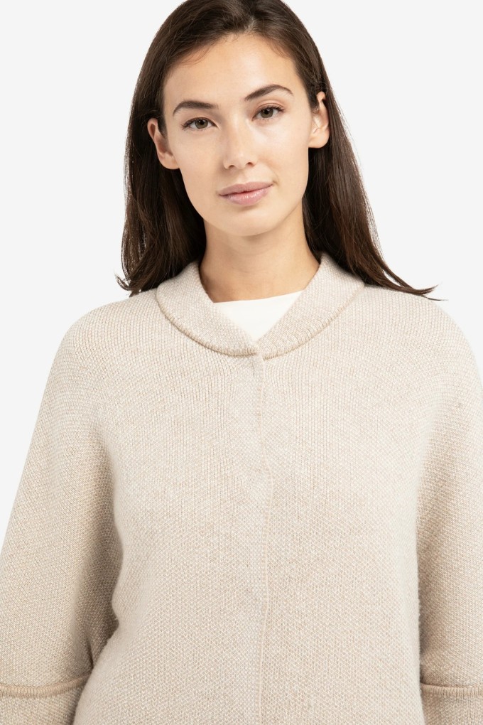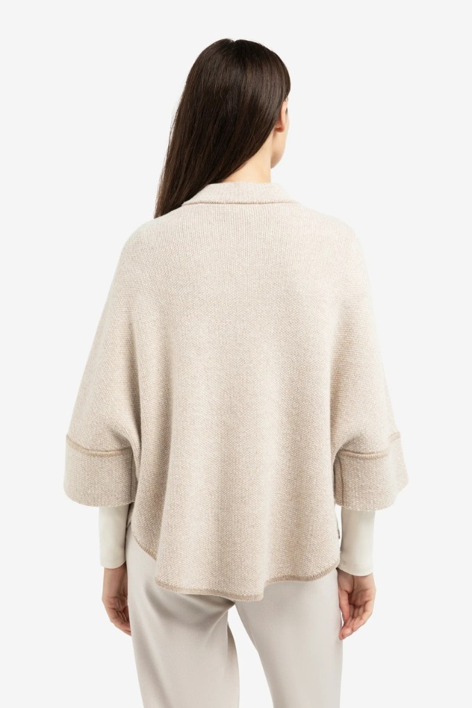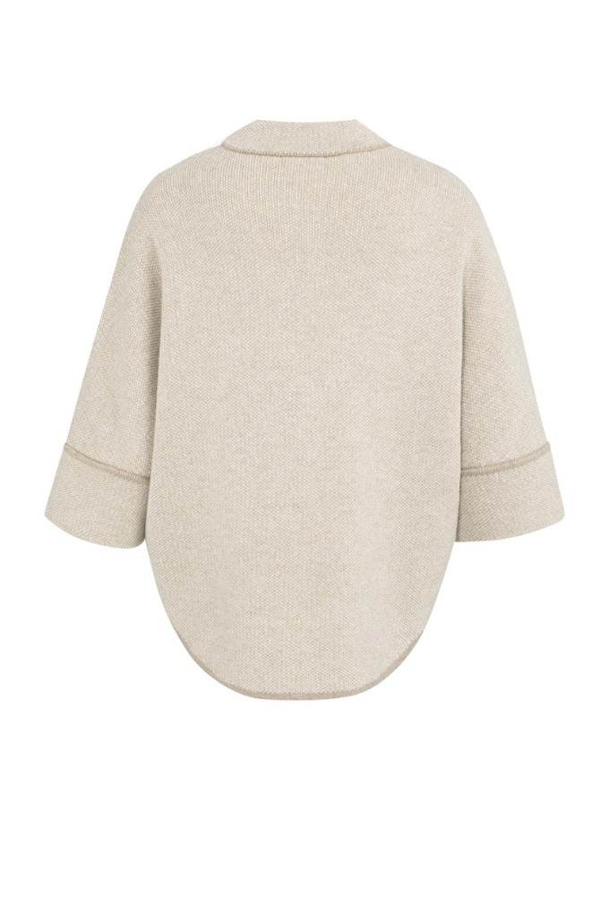 Ce cardigan poncho en maille douce et épaisse est tricoté en jacquard. Il présente une coupe oversize avec une base arrondie et des manches trois-quarts. Il possède également un col discret et des surpiqûres apparentes. Parfait pour les superpositions.