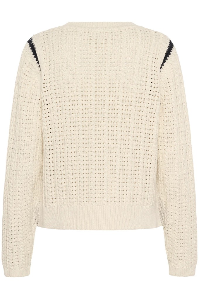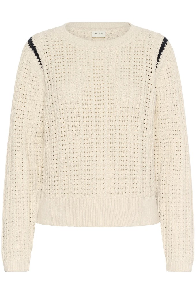Pull en maille ajourée et texturée possède des rayures bleu marine sur les épaules. Il a une coupe décontractée, une encolure ronde et des finitions côtelées.