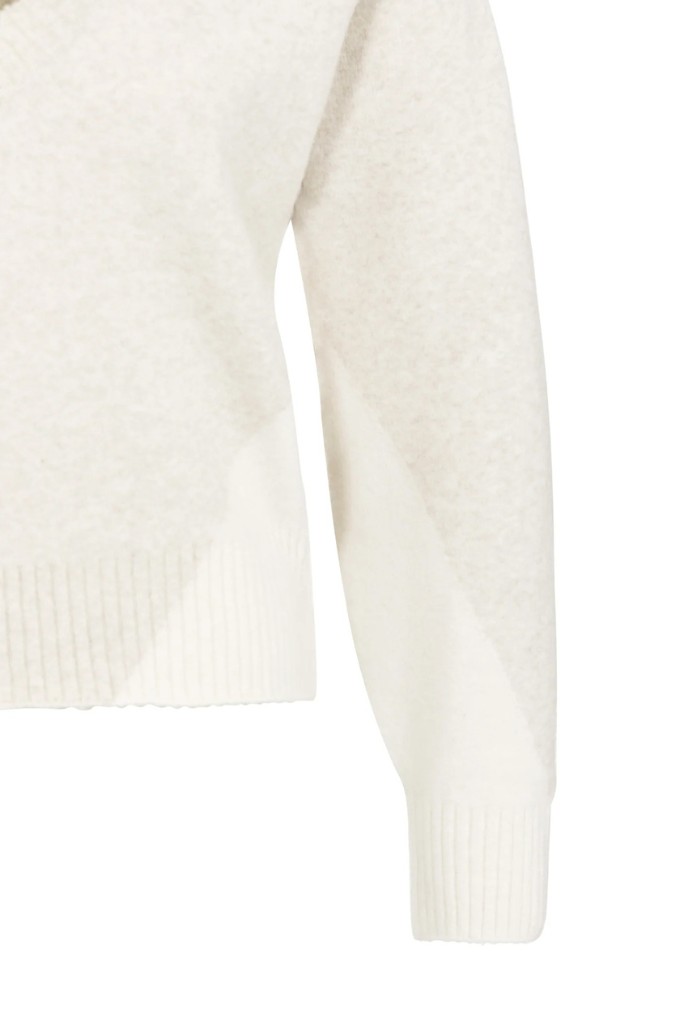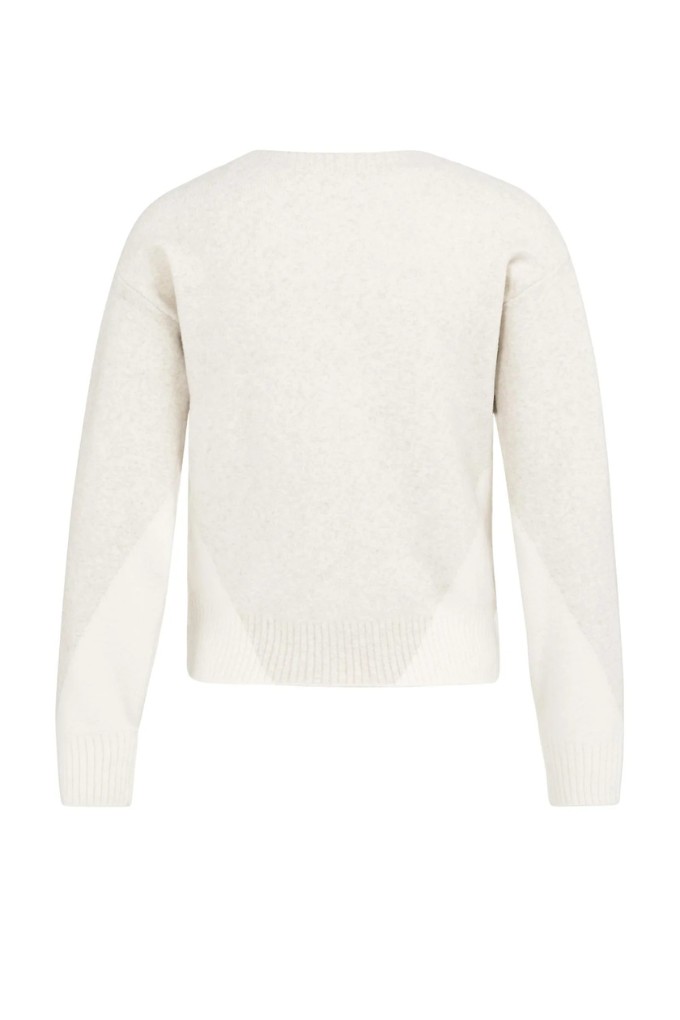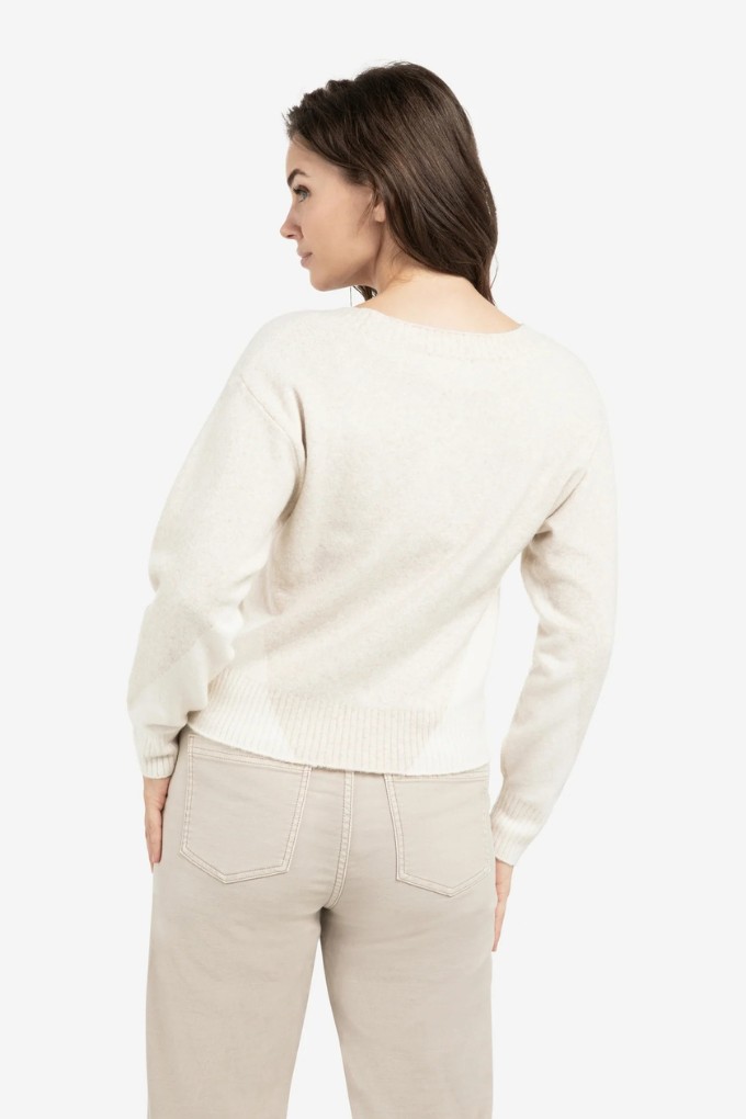Ce pull en maille douce présente une coupe droite, des manches longues et un profond col V. Il est conçu avec un discret motif color block ton sur ton, agrémenté de côtes aux poignets et à l’ourlet.