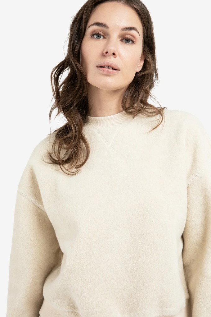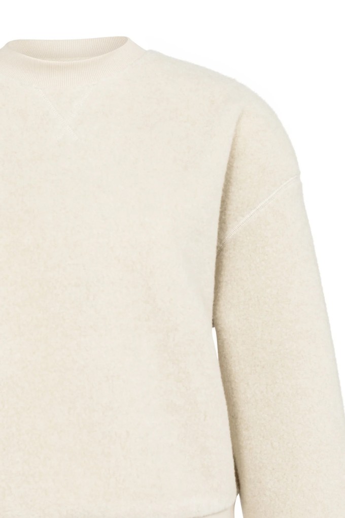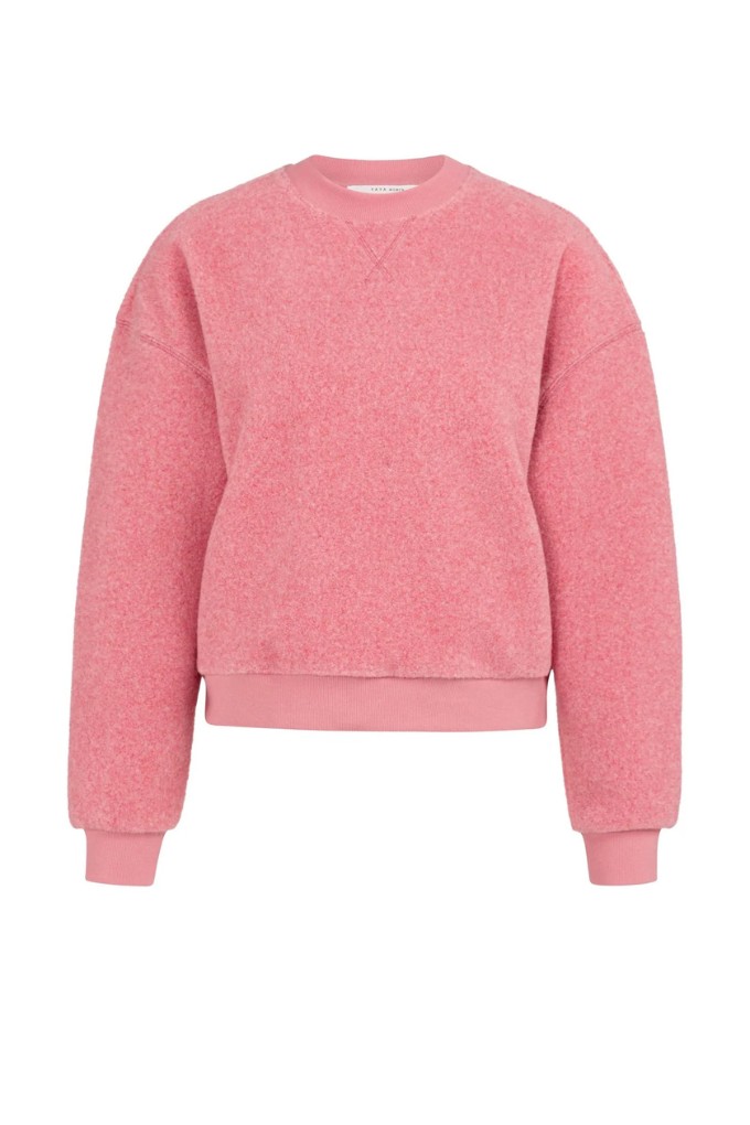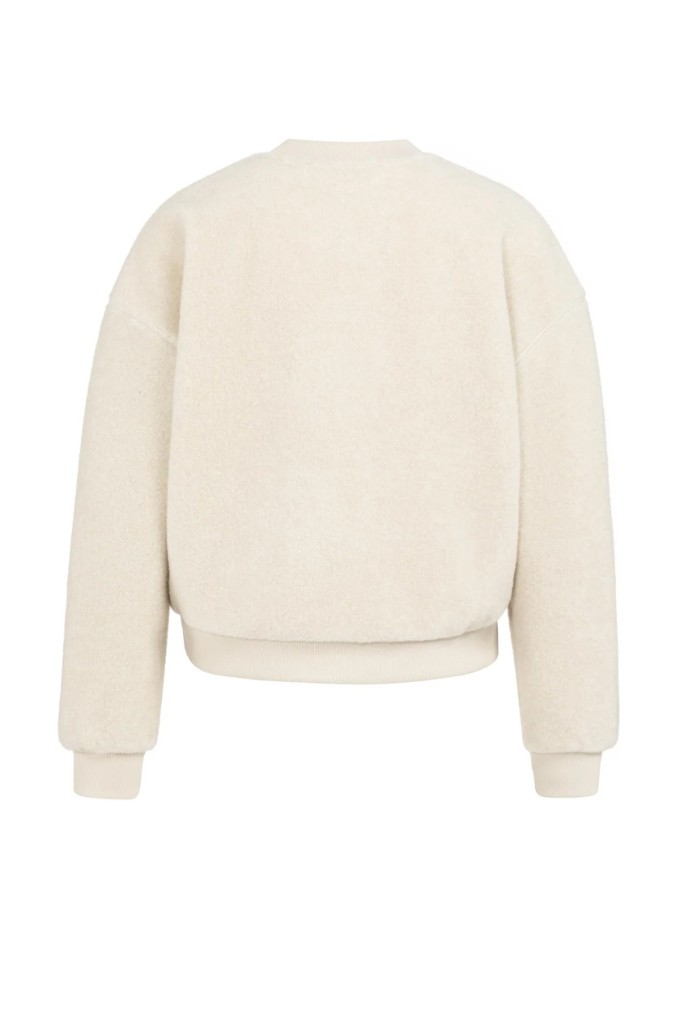 Ce pull teddy en maille duveteuse offre une coupe oversize confortable, des manches longues et une encolure ronde côtelée. Les poignets et l’ourlet sont également côtelés.