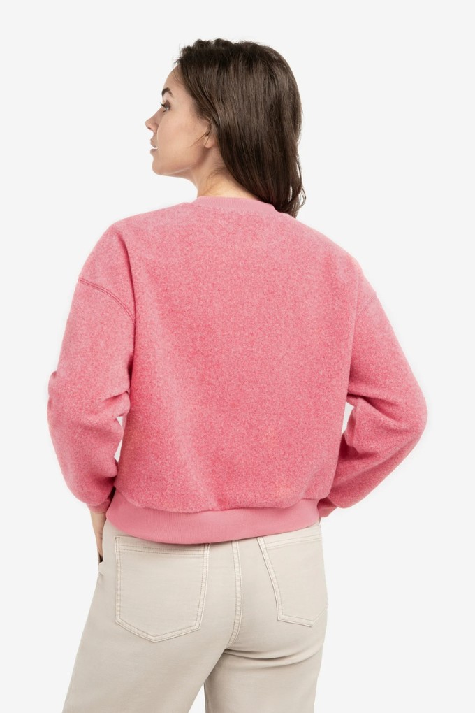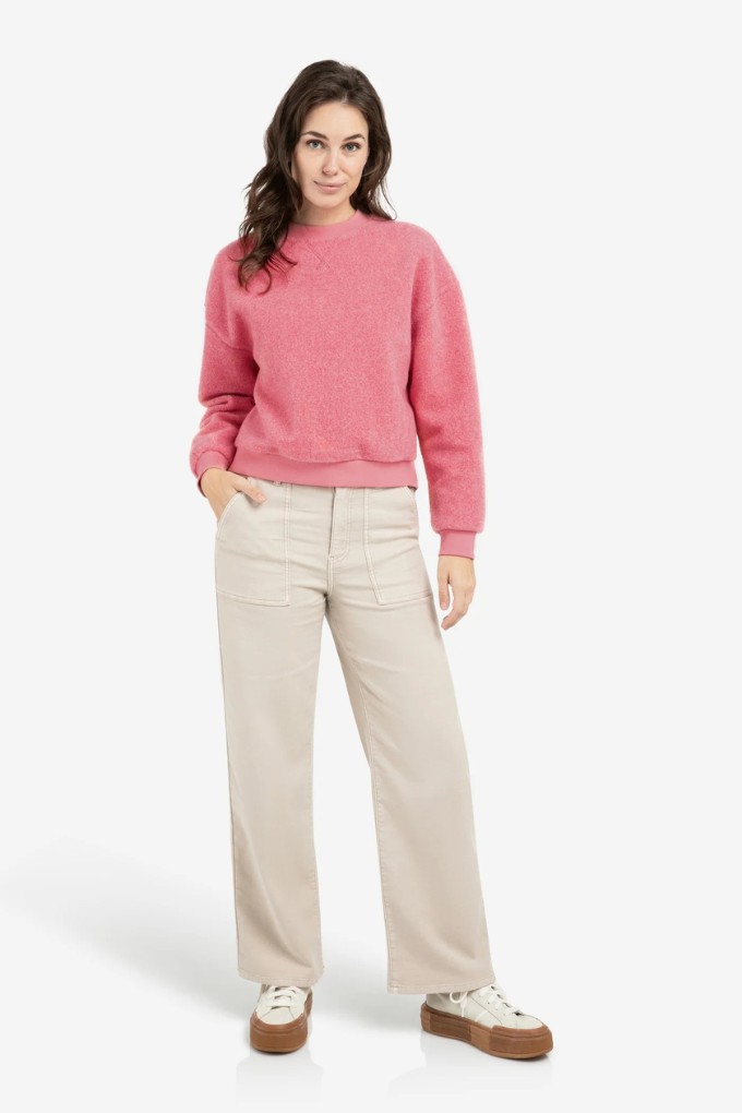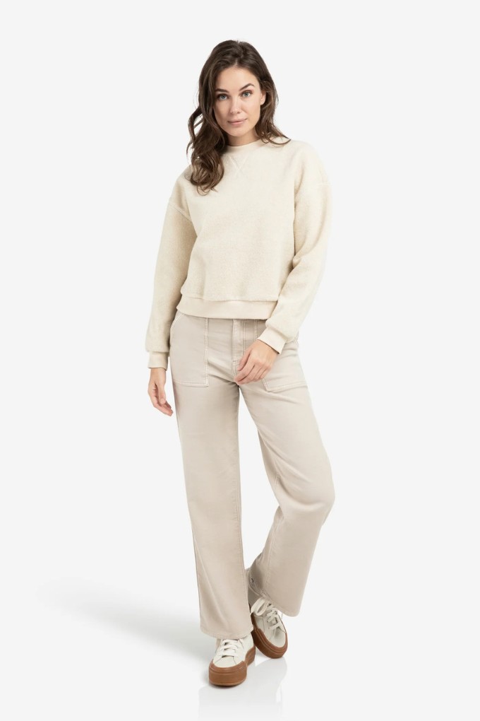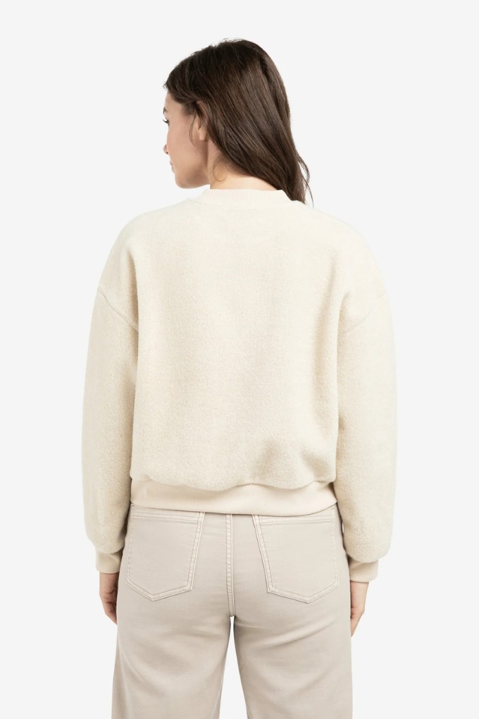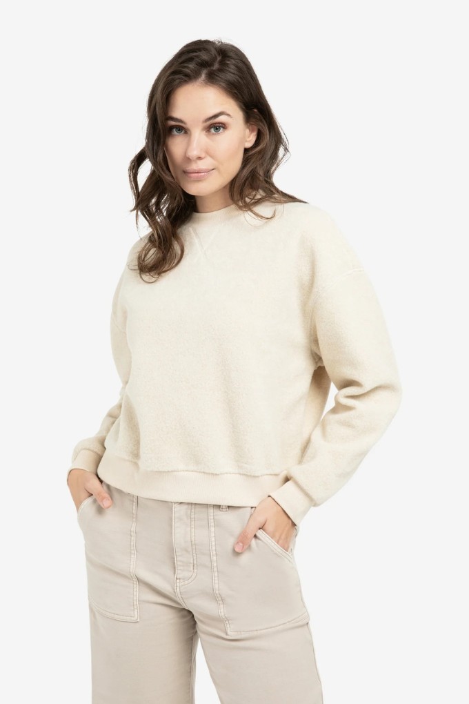 Ce pull teddy en maille duveteuse offre une coupe oversize confortable, des manches longues et une encolure ronde côtelée. Les poignets et l’ourlet sont également côtelés.
