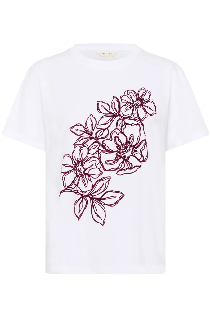 Ce t-shirt manches courtes simple arbore un joli motif floral bordeaux brodé à l’avant.