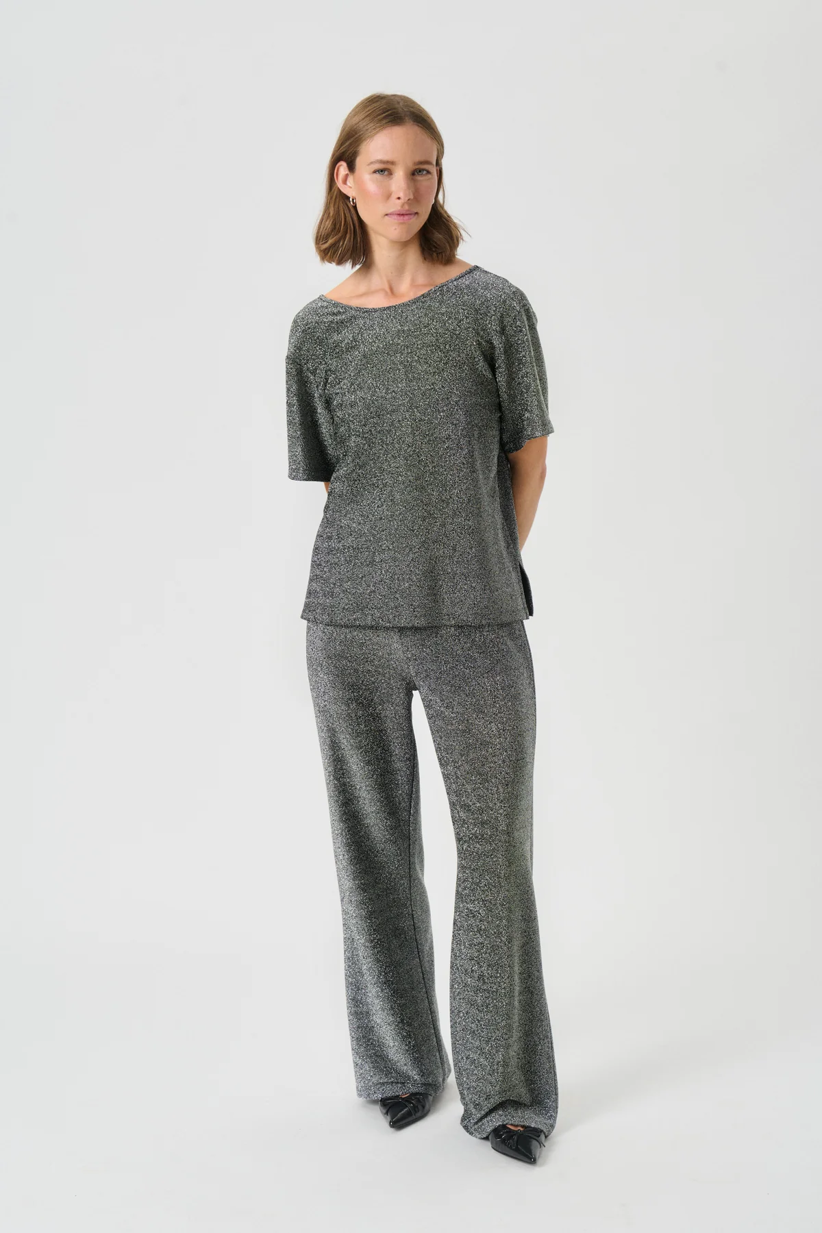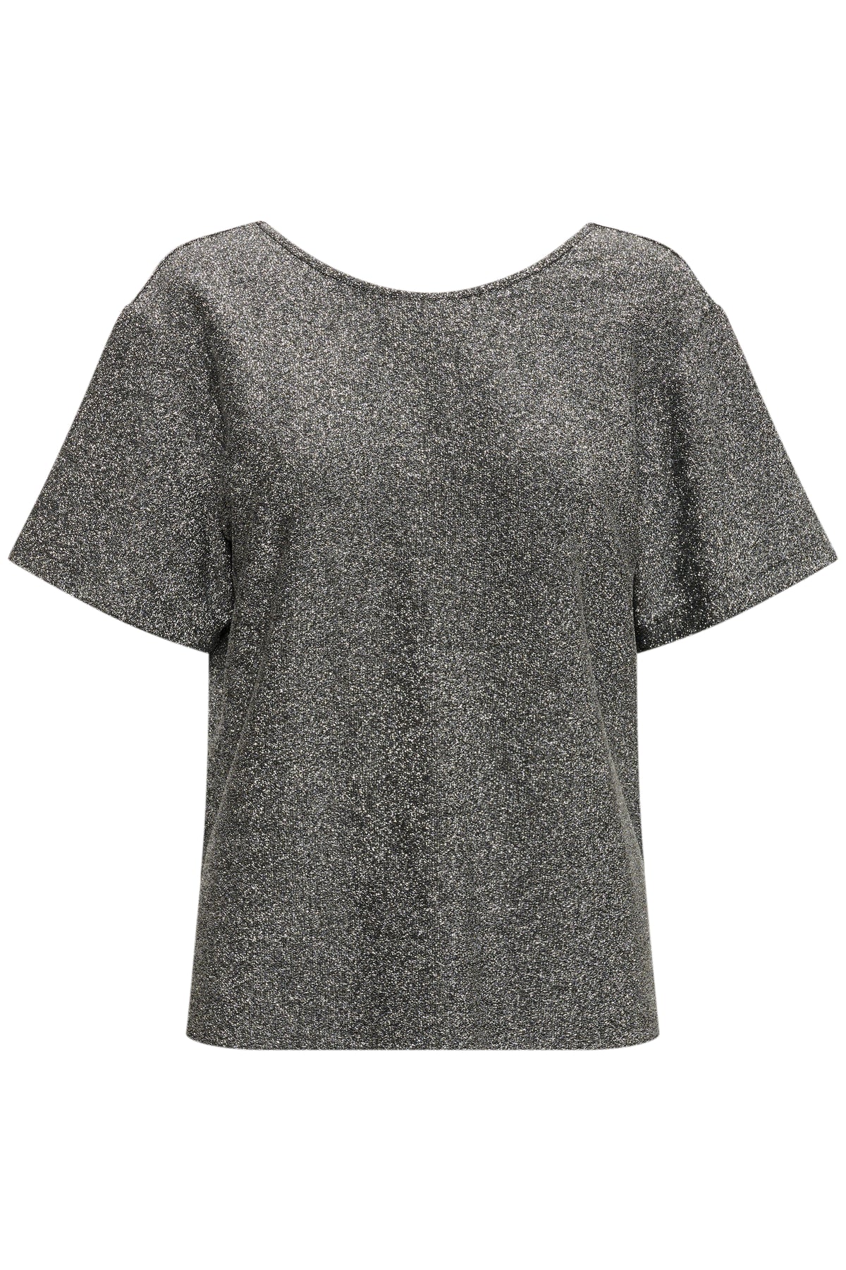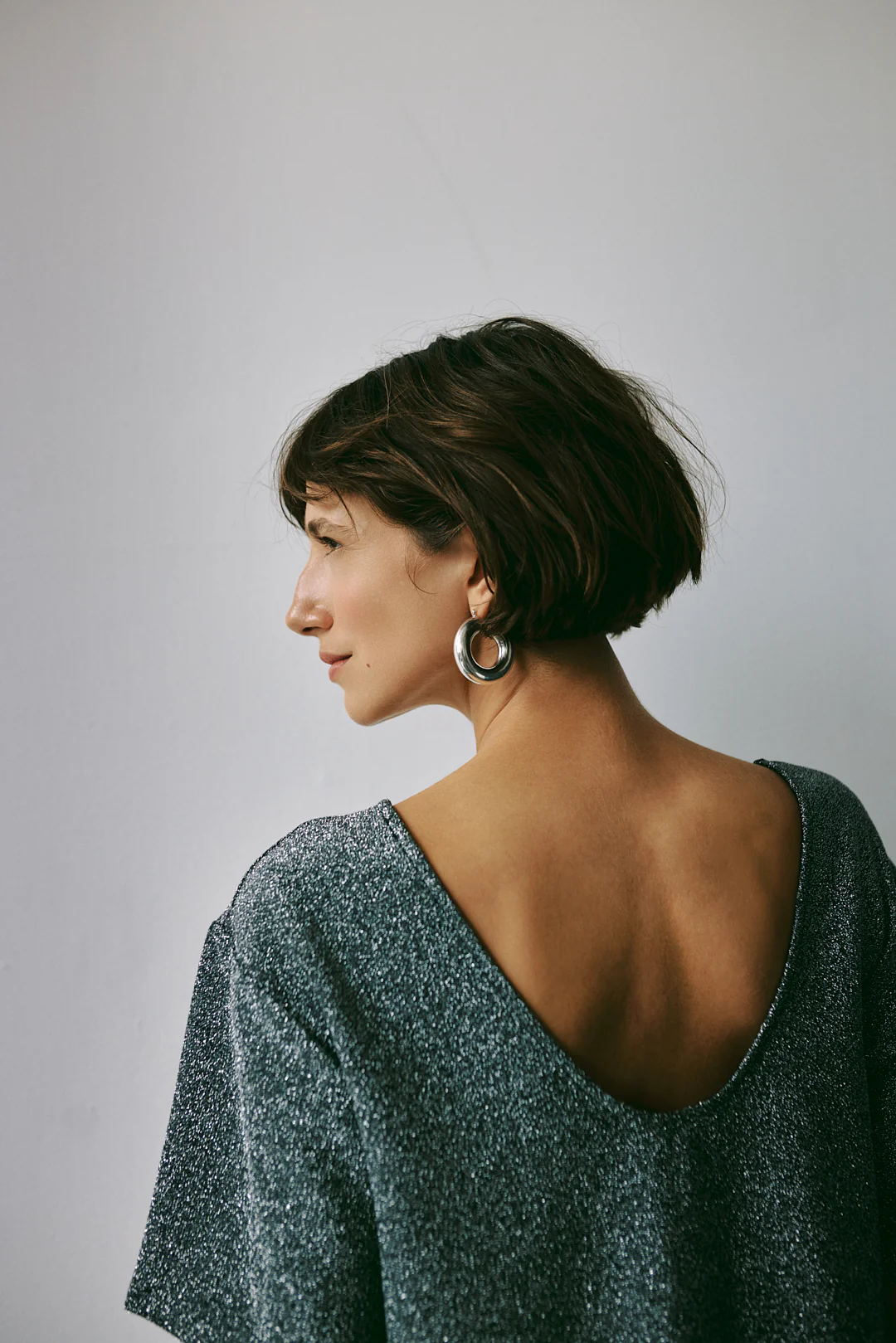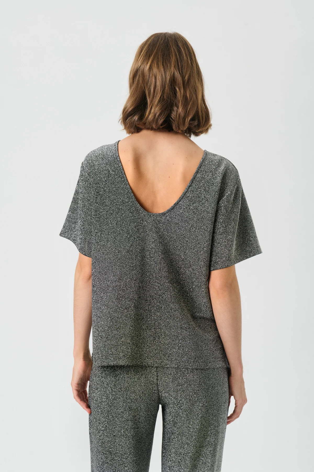 Ce top présente une large encolure ronde sur le devant et un décolleté en V dans le dos. Il présentes des épaules tombantes, des manches courtes et larges et des fentes latérales. Sa finition métallisée lui donne cet effet brillant idéal pour vos tenues de fêtes.